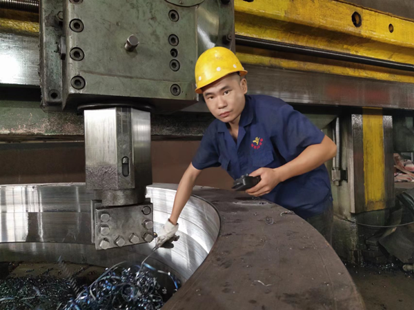 他為人憨厚老實(shí),吃苦耐勞,服從安排,任勞任怨,做事專注細(xì)致,被張主任看在眼里記在心里。因此當(dāng)8米立車一名師傅辭職后,他便按照“量才配崗”的原則,立即把趙江調(diào)到立車崗位,每天親自教他操作立車。通過他的嚴(yán)格要求,加上趙江堅持不懈的努力,他終于熟練掌握了立車的操作技術(shù)。如今,他在立車崗位上己經(jīng)做了兩年,前后己帶了兩位徒弟。每當(dāng)同事夸他上手快時,他卻覺得自己的技術(shù)離師傅還有很大差距?!凹埳蠈W(xué)來終覺淺,絕知此事要躬行。張主任的親自教導(dǎo)、我從書本上自學(xué)來的知識,自己按條條框框操作,這是打基礎(chǔ)。領(lǐng)悟了圖紙的加工要求后,在保證質(zhì)量的前提下,編寫好程序、各項參數(shù)、速度(包括進(jìn)給速度和轉(zhuǎn)速)后,我還必須隨時觀察車床上的一舉一動,監(jiān)管加工全過程,在工作實(shí)踐中不斷發(fā)現(xiàn)問題、思考問題、解決問題、總結(jié)經(jīng)驗。當(dāng)我能對具體問題具體分析具體解決并游刃有余時,我就從操作工變成師傅了,”趙江說。